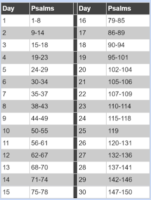 Choose how many Psalms you would like to pray each day. I started out with 10, then did 12 for a while, then 15, then 24. 12 offers a great balance in terms of time commitment, and it took me a solid two years to get any level of consistency with that.
